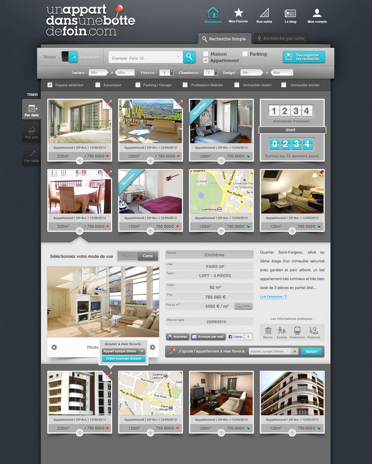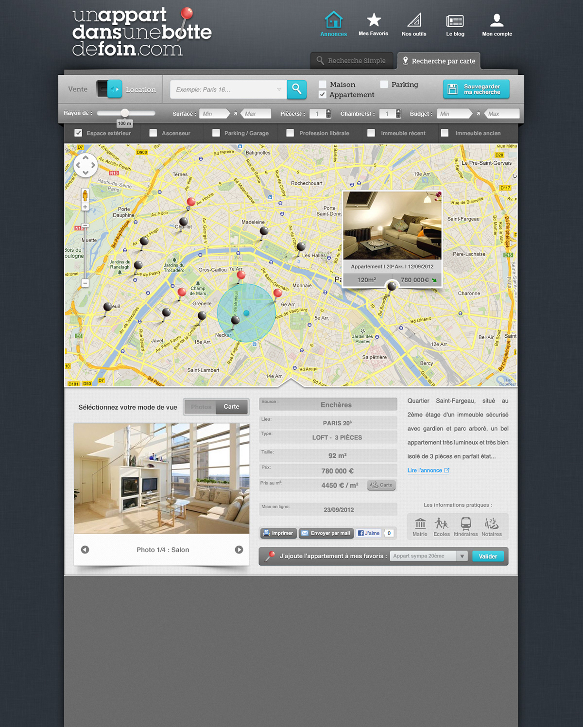 Création d'un design pour un outil de prospection immobilière qui accompagne l'acheteur (ou le locataire) tout au long de sa recherche. Directeur de la création : Emmanuel Lahaye - Agence Enjoy