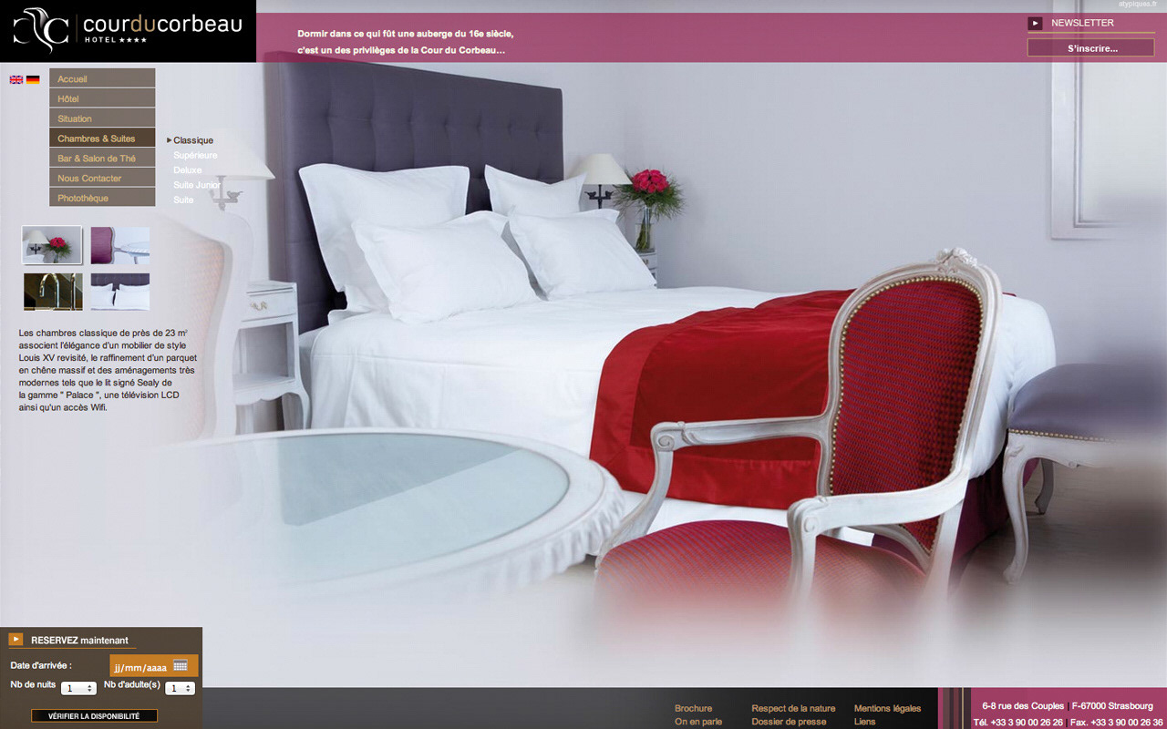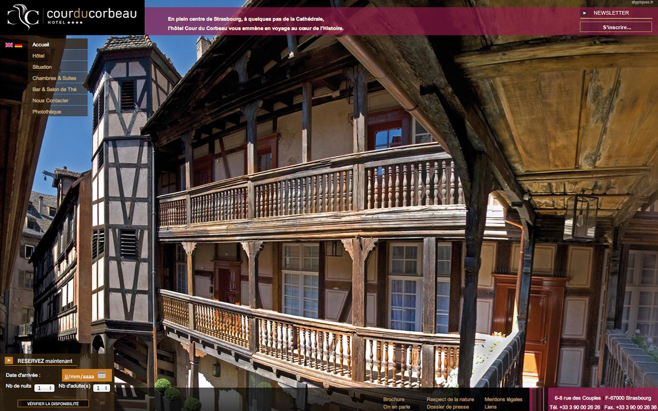 Création de l'identité web de l'hôtel 4 étoiles La Cour du Corbeau à Strasbourg.